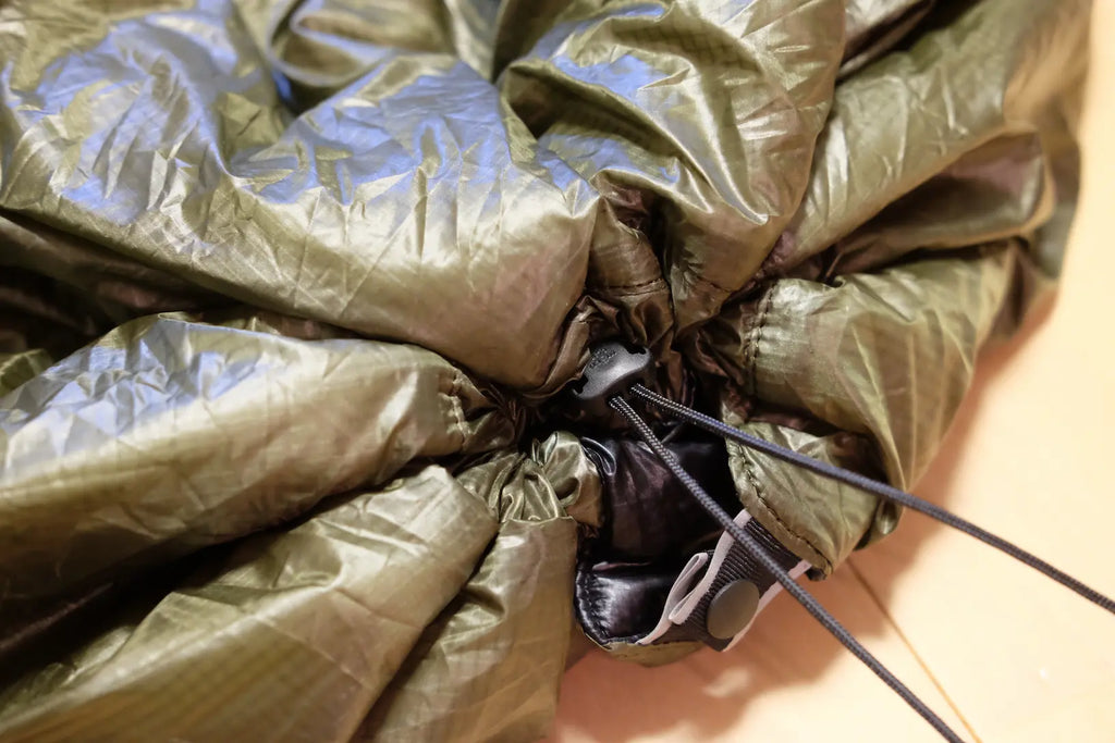 名の通り「化繊ブランケット」なんですが、両端にドローコードが付いているので、下の画像のように端を絞れば、簡易的なマミー型シュラフに変形。